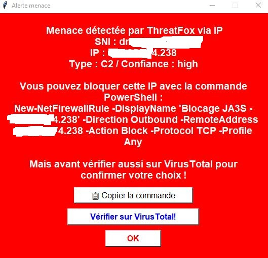 JA3S Defender est un agent de cybersécurité léger, open-source, qui pourrait contribuer à détecter des communications TLS suspectes via l’empreinte JA3S, en interrogeant automatiquement ThreatFox et en suggérant le blocage via le pare-feu Windows.